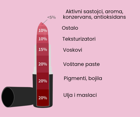 Možda izgleda jednostavno, ali iza njega stoji mala, dobro promišljena formula. Svaki sastojak ima svoju ulogu: neki drže ruž čvrstim, neki njeguju usne, a neki mu daju boju i karakter.